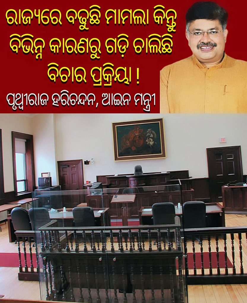 ରାଜ୍ୟର ବିଭିନ୍ନ ଜିଲ୍ଲା ଓ ନିମ୍ନ ଅଦାଲତରେ ଏବେ ମୋଟ ୧୯ ଲକ୍ଷ ୯୭ ହଜାର ୩୧୭ ମାମଲା ବିଚାର ଅପେକ୍ଷାରେ ପଡ଼ି ରହିଛି !ସେଥିରୁ ଫୌଜଦାରୀ ମାମଲା ସଂଖ୍ୟା ୧୬ ଲକ୍ଷ ୮୪ ହଜାର ୪୩୨ ଏବଂ ଦେଓ୍ୱାନୀ ମାମଲା ସଂଖ୍ୟା ୩ ଲକ୍ଷ ୧୨ ହଜାର ୮୮୫ ବୋଲି ରାଜ୍ୟ ଆଇନ ମନ୍ତ୍ରୀ ପୃଥ୍ୱୀରାଜ ହରିଚନ୍ଦନ ଆଜି ବିଧାନସଭାରେ ଏକ ପ୍ରଶ୍ନର ଉତ୍ତରରେ ଏହା ପ୍ରକାଶ କରିଛନ୍ତି !