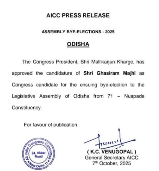 ନୂଆପଡା ବିଧାନସଭା ଉପନିର୍ବାଚନ ପାଇଁ ପ୍ରାର୍ଥୀ ଘୋଷଣା କଲା କଂଗ୍ରେସ । ଘାସିରାମ ମାଝୀ ନୂଆପଡ଼ା ପାଇଁ କଂଗ୍ରେସ ପ୍ରାର୍ଥୀ । ଏଆଇସିସି ପକ୍ଷରୁ ଘାସିରାମଙ୍କ ପ୍ରାର୍ଥୀତ୍ୱ ଉପରେ ସହମତି ପ୍ରକାଶ ପାଇଛି।
