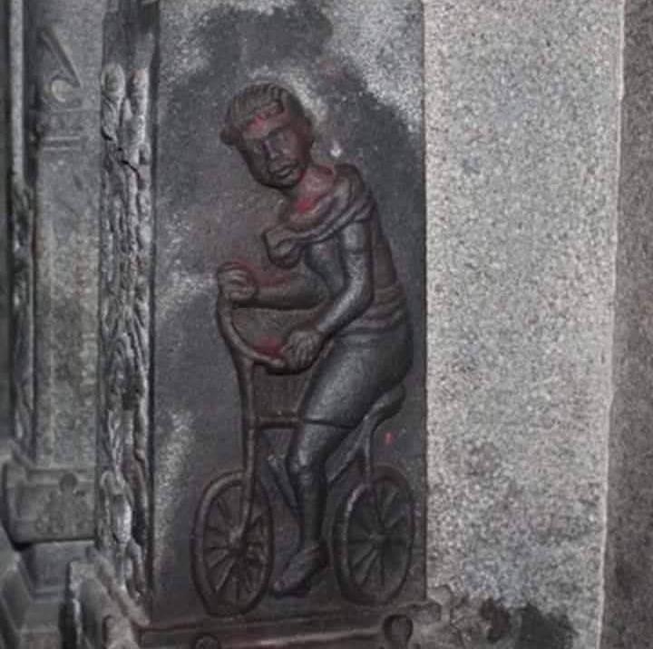 ତାମିଲନାଡୁର ପ୍ରାଚୀନ ପଞ୍ଚବର୍ଣ୍ଣ ସ୍ୱାମୀ ମନ୍ଦିରର କାନ୍ଥରେ ସାଇକେଲ ଚଲାଉଥିବା ଜଣେ ବ୍ୟକ୍ତିଙ୍କ ମୂର୍ତ୍ତି ରହିଛି।