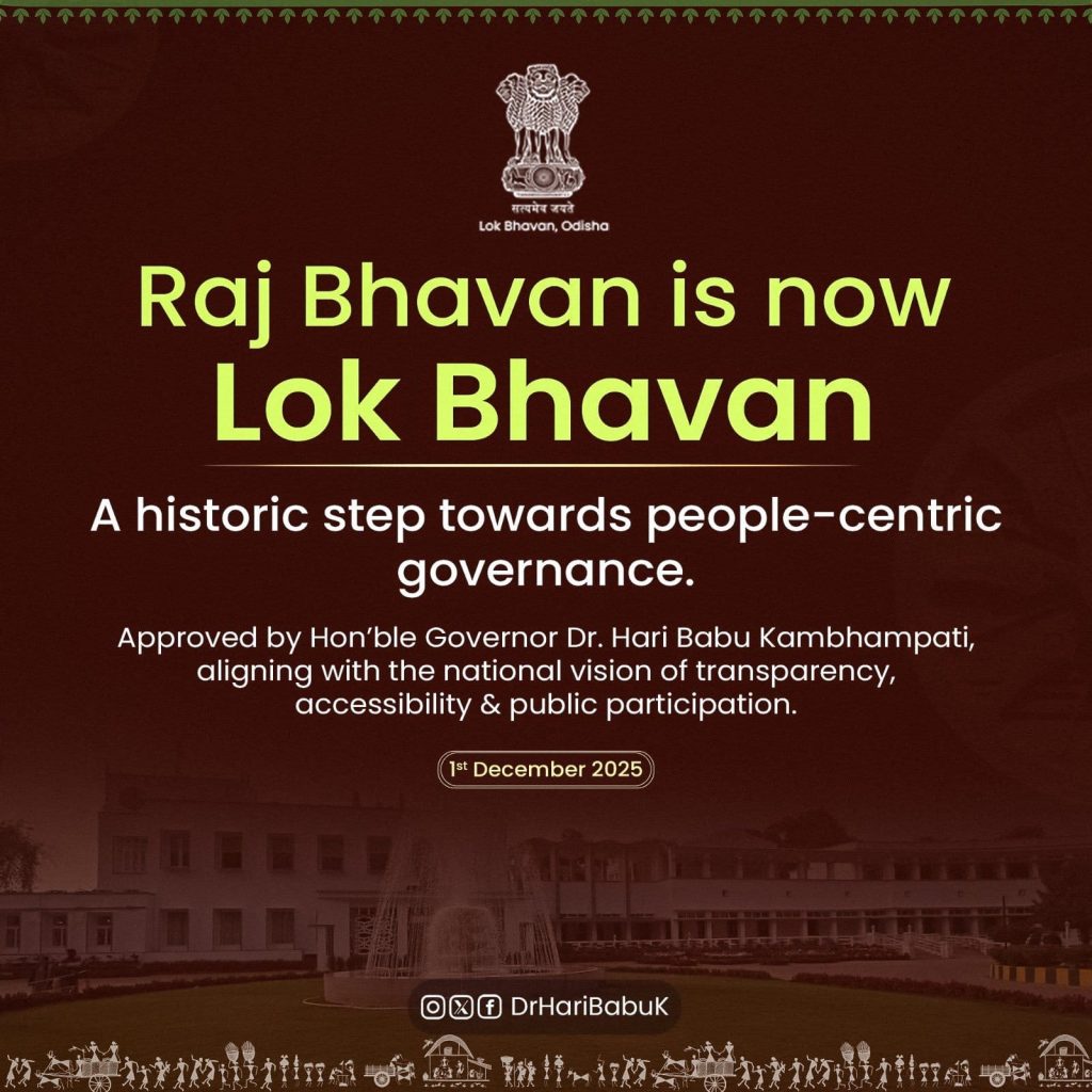 ରାଜ ଭବନ ହେଲା ଲୋକ ଭବନ**ବଦଳିଲା ରାଜ ଭବନ ନାଁ, ହେଲା ଲୋକ ଭବନ**କେନ୍ଦ୍ର ଗୃହ ମନ୍ତ୍ରାଳୟ ନିଷ୍ପତ୍ତି ଆଧାରରେ ବିଜ୍ଞପ୍ତି ପ୍ରକାଶ**ଭୁବନେଶ୍ୱର ଓ ପୁରୀ ରାଜ ଭବନ ନାଁ ହେଲା ଲୋକ ଭବନ**ସରକାରୀ ଭାବେ ଲୋକ ଭବନ ଲେଖାଯିବ**'X' ରେ ସୂଚନା ଦେଲେ ରାଜ୍ୟପାଳ ଡ. ହରିବାବୁ କମ୍ଭମପାଟି*