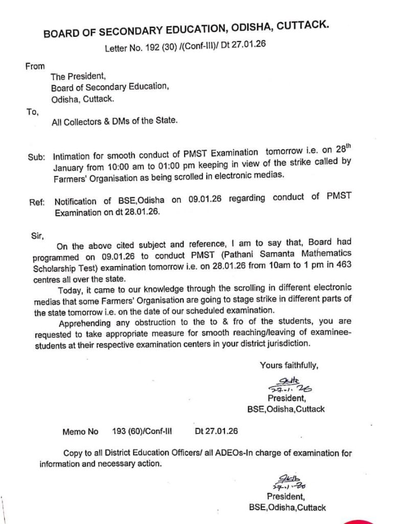-ବୁଧବାରର PMST ପରୀକ୍ଷା ନେଇ ସବୁ ଜିଲ୍ଲାପାଳମାନଙ୍କୁ BSEର ଚିଠି। -ପଠାଣୀ ସାମନ୍ତ ଗଣିତ ମେଧାବୃତ୍ତି ପରୀକ୍ଷା (PMST) ପାଇଁ ଚିଠି ।-କିଛି କୃଷକ ସଂଗଠନର ବନ୍ଦ ଡାକରା ପାଇଁ ଯେପରି ପ୍ରଭାବ ନ ପଡ଼ିବ ତାଗିଦ ।