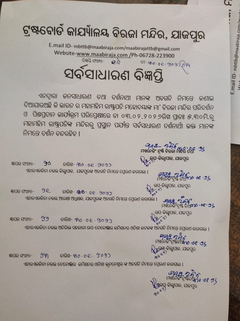 • ରାଷ୍ଟ୍ରପତି ମନ୍ଦିରରୁ ଫେରିବା ପଯ୍ୟନ୍ତ ଏହି କଟକଣା ଜାରି କରିଛି ମନ୍ଦିର ପ୍ରଶାସନ।