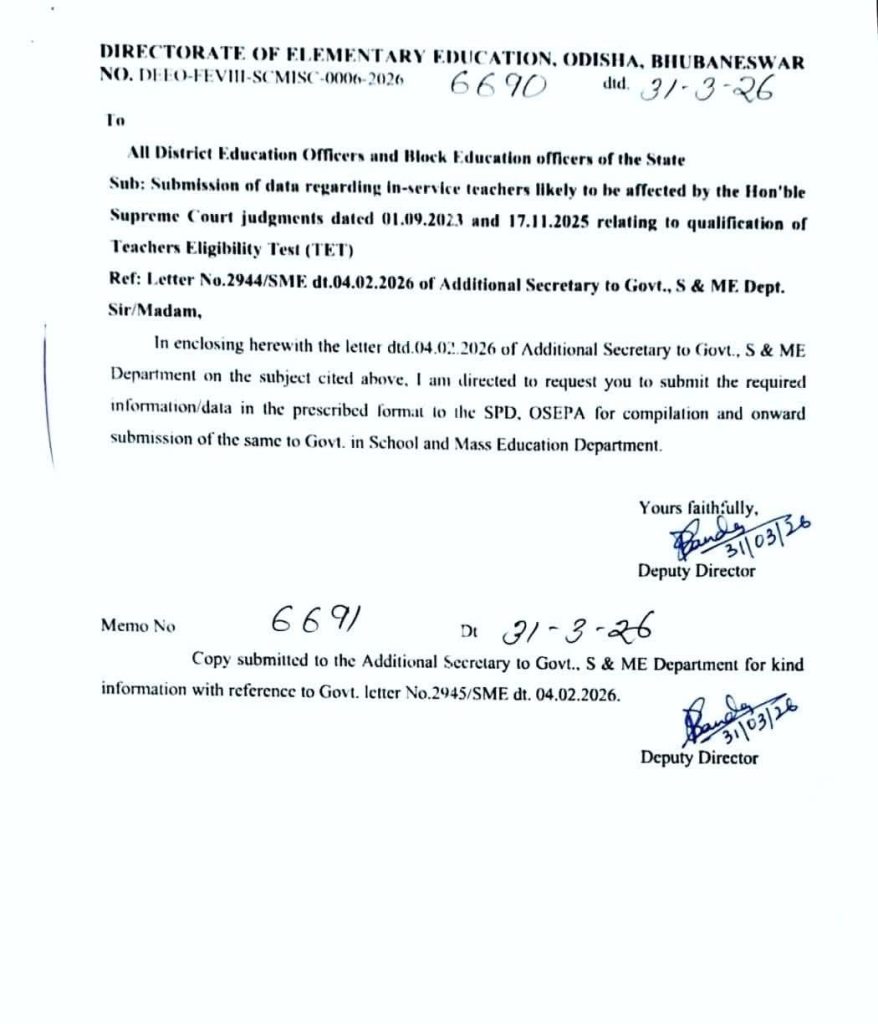 📍ମାନ୍ୟବର ସୁପ୍ରିମକୋର୍ଟଙ୍କର #TET_ OTET ସମ୍ପର୍କିତ ଜଜମେଣ୍ଟ ଫଳରେ କେତେ ଶିକ୍ଷକ ଶିକ୍ଷୟିତ୍ରୀ ପ୍ରଭାବିତ ହେବେ, ତାର ତଥ୍ୟ ମାଗିଲେ ଓଡ଼ିଶା ସରକାର। ପ୍ରାଥମିକ ଶିକ୍ଷା ନିର୍ଦ୍ଦେଶାଳୟ ମାଗିଲେ ତଥ୍ୟ
