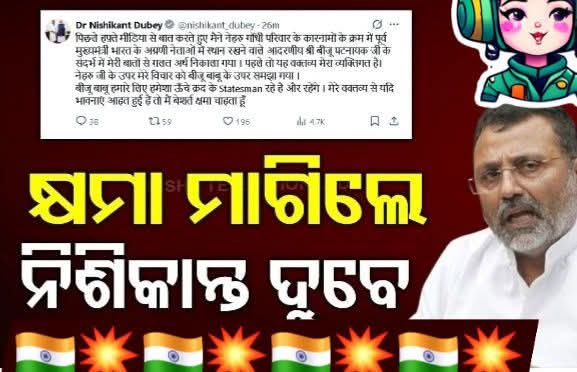 ପ୍ରବାଦ ପୁରୁଷ ବିଜୁ ପଟ୍ଟନାୟକଙ୍କୁ ଅପମାନ ଦେଇଥିବାରୁ ବାଧ୍ୟ ହୋଇ କ୍ଷମା ମାଗିଛନ୍ତି। ସାରା ଦେଶରେ ପ୍ରବଳ ବିରୋଧ ପରେ ସେ କ୍ଷମା ମାଗିଛନ୍ତି। ସୋସିଆଲ ମିଡିଆରେ ସେ ପୋଷ୍ଟ କରିଛନ୍ତି, ମୋର ମତକୁ କଦର୍ଥ କରାଯାଇଥିଲା। ବିଜୁ ବାବୁ ସବୁବେଳେ ସମ୍ମାନସ୍ପଦ ଷ୍ଟେଟସ୍ ମ୍ୟାନ ଅଟନ୍ତି ଓ ଷ୍ଟେଟସମ୍ୟାନ ହୋଇ ରହିବେ। ମୋ ମତ ଯଦି ଆଘାତ ଦେଇଛି, ମୁଁ ନିଃସର୍ତ୍ତ କ୍ଷମା ପ୍ରାର୍ଥନା କରୁଛି ବୋଲି କହିଛନ୍ତି ନିଶିକାନ୍ତ ଦୁବେ। ୧୯୬୨ ମସିହାରେ ଚୀନ ଯୁଦ୍ଧ ବେଳେ ବିଜୁ ବାବୁ ସିଆଇଏ ଏଜେଣ୍ଟ ସାଜିଥିଲେ ବୋଲି ଅରୁଚିକର ମନ୍ତବ୍ୟ ଦେଇଥିଲେ ନିଶିକାନ୍ତ। ଏହାକୁ ନେଇ ସାରା ଦେଶରେ ତୀବ୍ର ପ୍ରତିକ୍ରିୟା ପ୍ରକାଶ ପାଇଥିଲା। ଓଡ଼ିଶା ସମେତ ଦେଶରେ, ଏପରିକି ପାର୍ଲାମେଣ୍ଟରେ କଥା ଉଠିଥିଲା। ଶେଷରେ ବାଧ୍ୟ ହୋଇ କ୍ଷମା ମାଗିଛନ୍ତି ବିଜେପି ସାଂସଦ ନିଶିକାନ୍ତ ଦୁବେ।