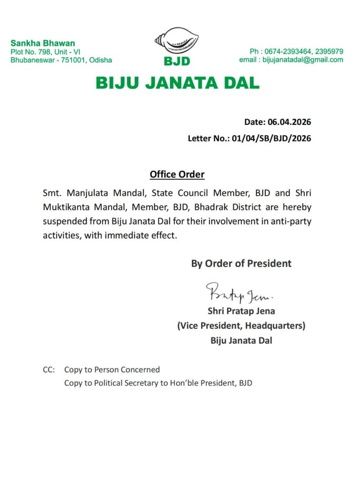 • ମଞ୍ଜୁଲତା ମଣ୍ଡଳ ଓ ମୁକ୍ତିକାନ୍ତ ମଣ୍ଡଳ ବିଜେଡିରୁ ସସ୍‌ପେଣ୍ଡ୍‌