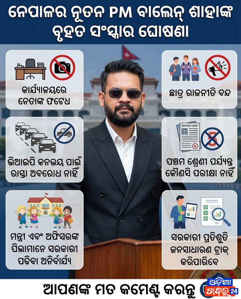 ନେପାଳ ରାଜନୀତିରେ ବଡ଼ ବିପ୍ଳବ! ବାଲେନ୍ ଶାହାଙ୍କ ୬ଟି ଐତିହାସିକ ସଂସ୍କାର ଘୋଷଣା।ନେପାଳର ଚର୍ଚ୍ଚିତ ନେତା ବାଲେନ୍ ଶାହାଙ୍କ ନୂତନ ଶାସନ ବ୍ୟବସ୍ଥାକୁ ନେଇ ଏବେ ସାରା ବିଶ୍ୱରେ ଚର୍ଚ୍ଚା ଚାଲିଛି। ସାଧାରଣ ଜନତାଙ୍କ ସୁବିଧା ଏବଂ ପ୍ରଶାସନିକ ସ୍ୱଚ୍ଛତା ପାଇଁ ସେ କିଛି ଏଭଳି କଡ଼ା ନିଷ୍ପତ୍ତି ନେଇଛନ୍ତି, ଯାହା ଅନ୍ୟ ଦେଶମାନଙ୍କ ପାଇଁ ଏକ ଉଦାହରଣ ସାଜିପାରେ।